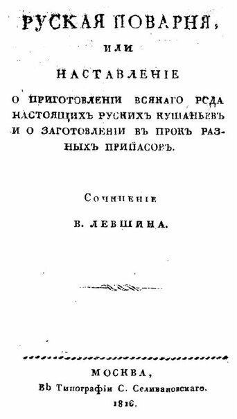 В. Левшин. Русская поварня, или наставление о приготовлении всякого рода настоящих русских кушаньев и о заготовлении впрок разных припасов. Москва: Типография С. Селивановского, 1816